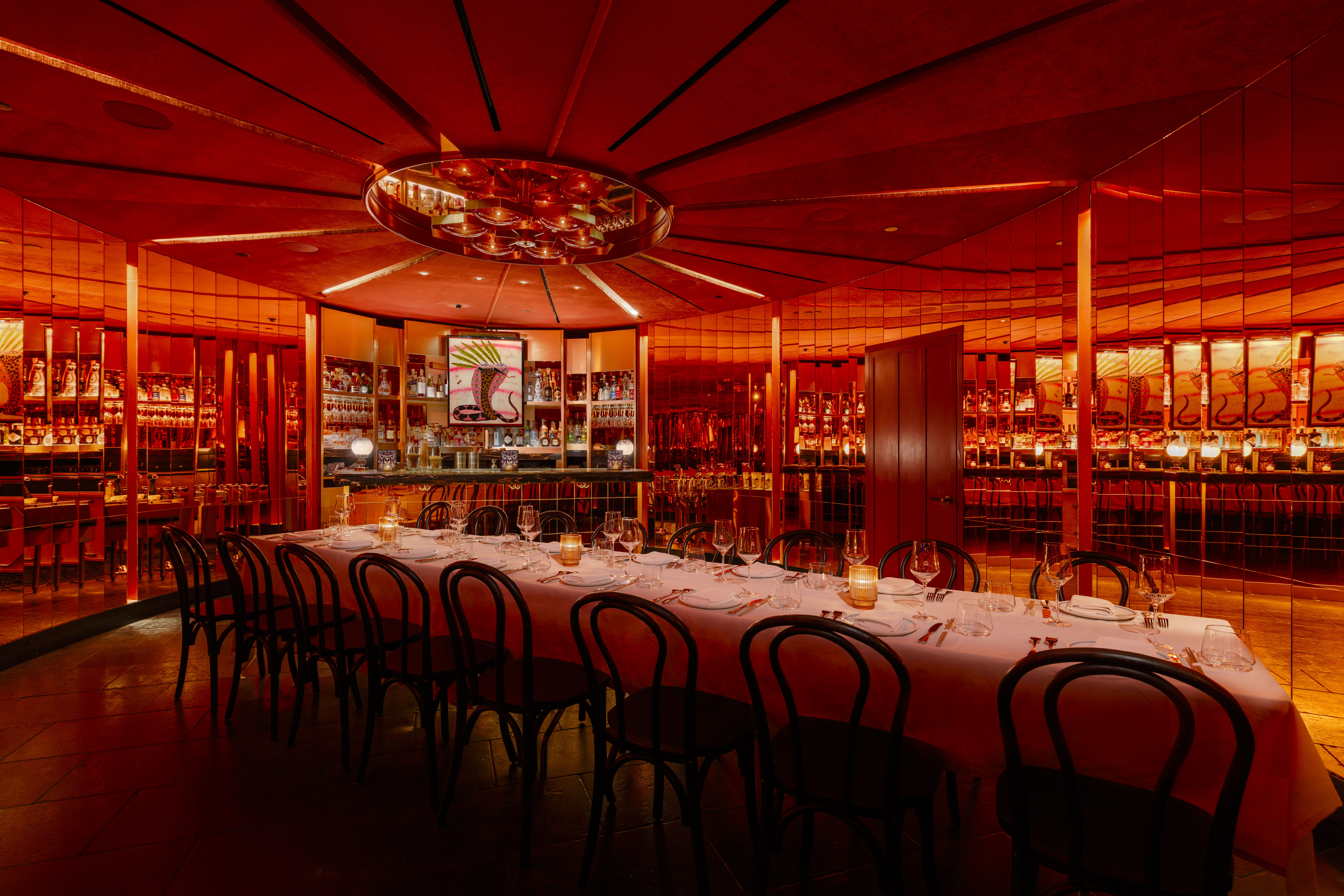 The Mirror Room is a standalone bar within the restaurant, available for chici cocktail events or seated dinners. Dedicated bartenders shake and stir up signature cocktails behind the marble bartop adorned with vintage lamps and an impressive collection of whiskies. The oval shape of The Mirror Room is emphasized by continuous mirrored panels around the room, creating an entrancing atmosphere. A rich velvet-covered ceiling and warm light channels keep the space inviting and alluring. Rattan pendant lights anchor two small banquettes covered in animal print-inspired fabric, opposite of a Jordan Kerwick original painting at the back bar.